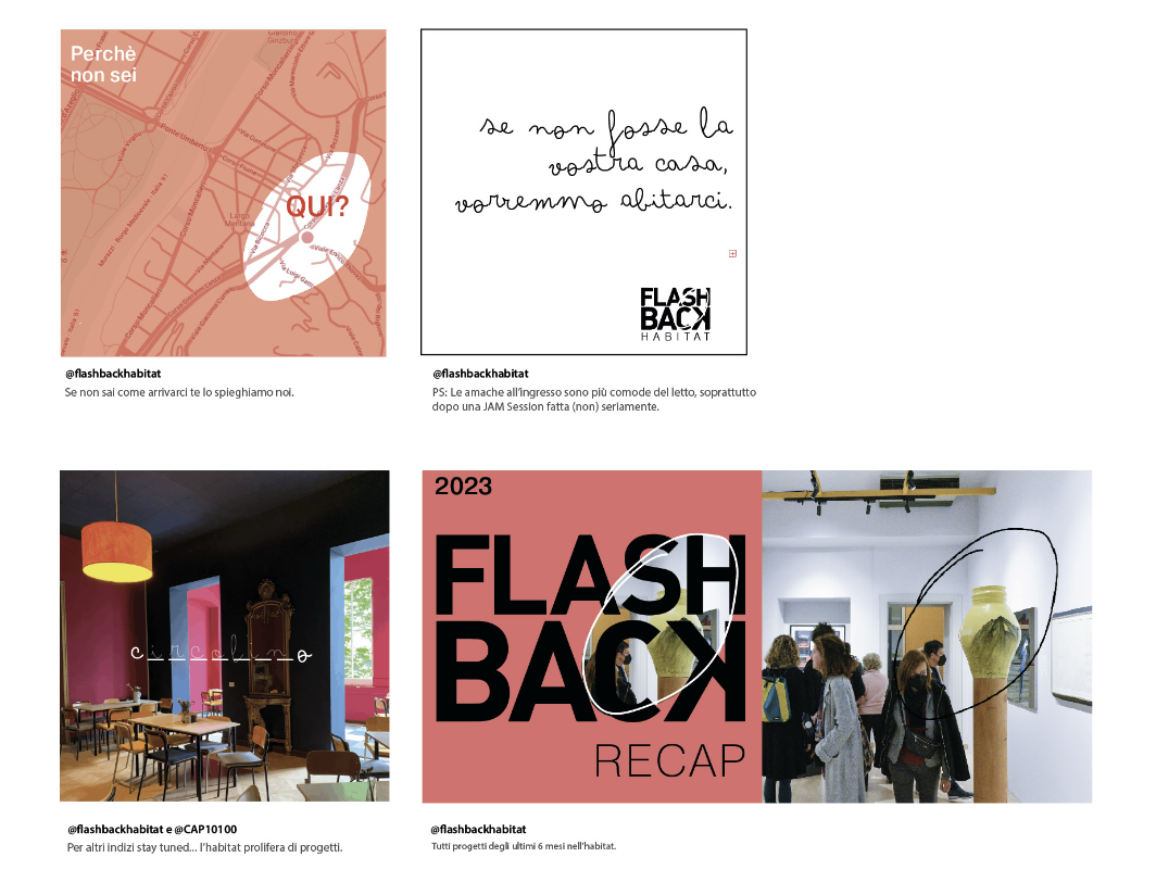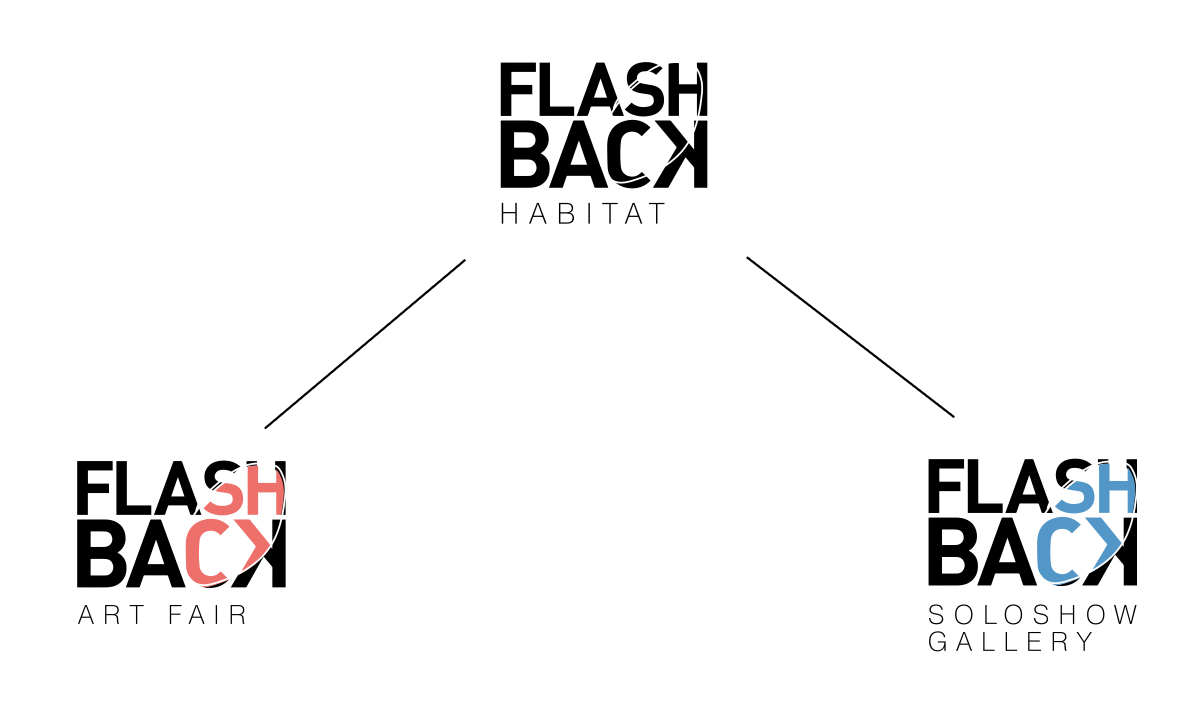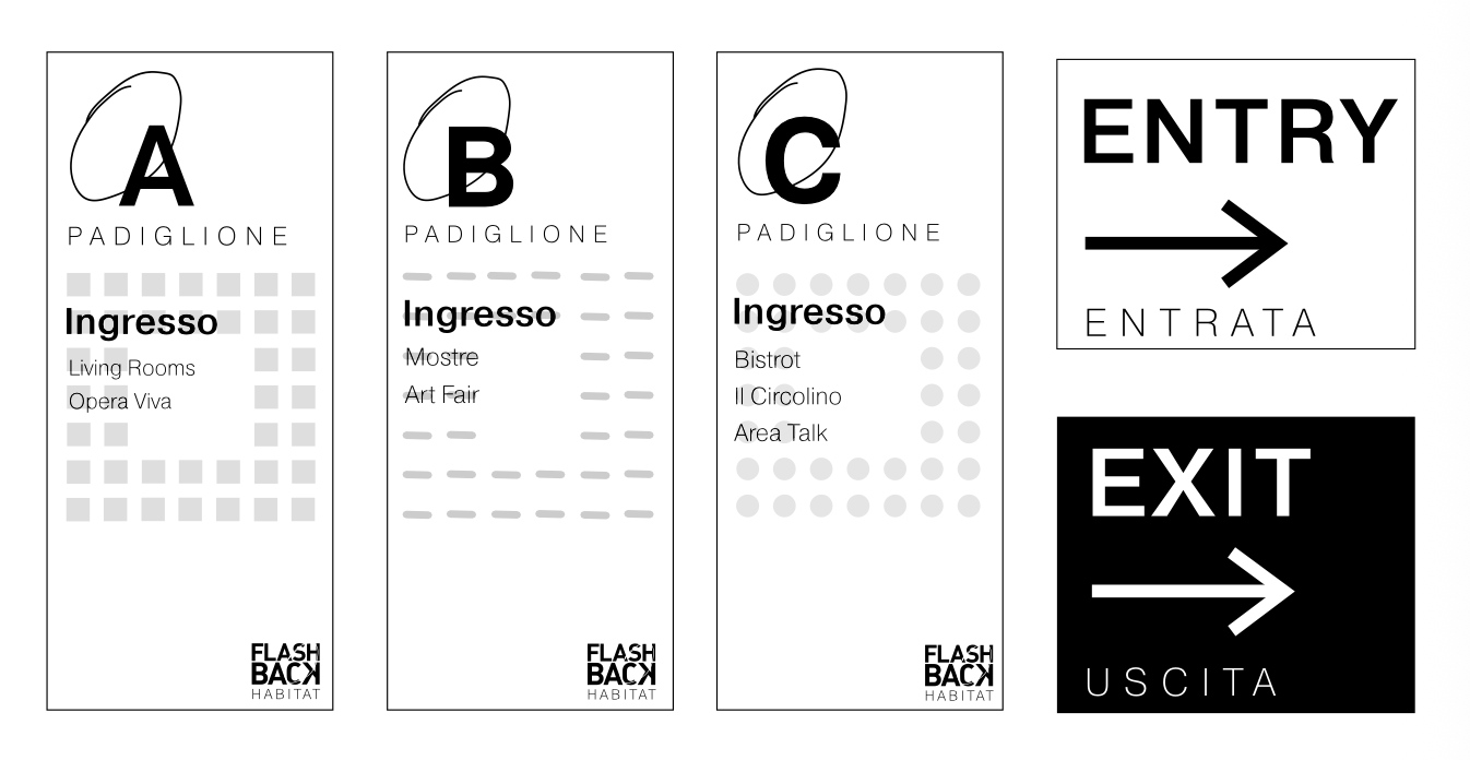 The Flashback Habitat logo was redesigned starting from a structured grid, used as a guiding matrix to ensure consistency, balance, and clarity within the visual identity. This geometric approach allowed for refined proportions and a more cohesive, recognizable mark. Building on this system, the internal signage was then developed, with each element following the same visual logic—resulting in a unified, functional, and aesthetically coherent wayfinding experience throughout the space.
